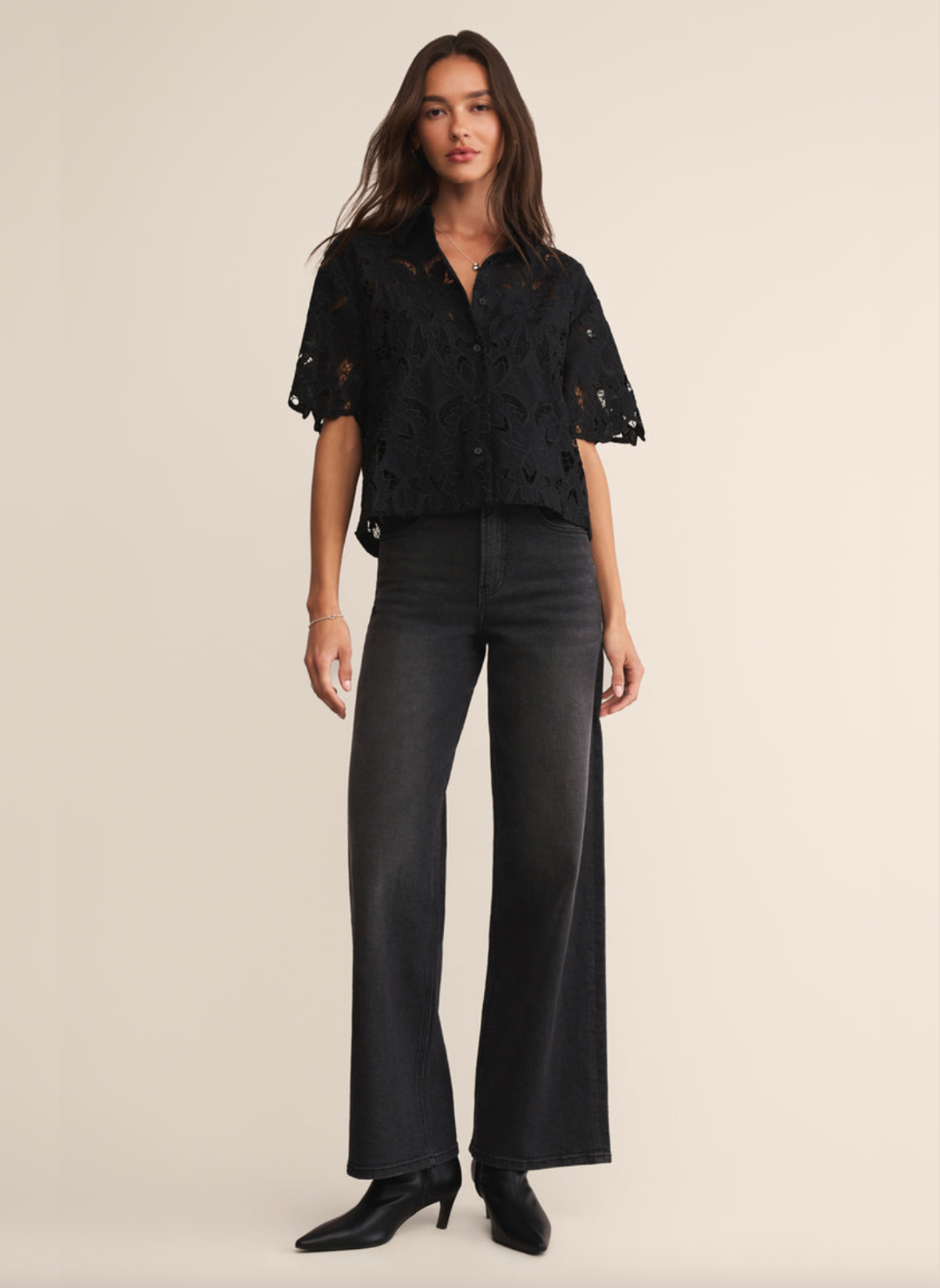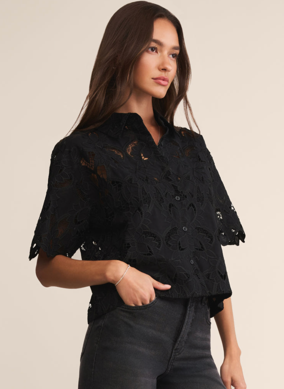 Meet your new go-to statement blouse: the Z Supply Midnight Lace Top. This effortlessly chic button-up blends delicate embroidery with breezy cotton crepe fabric, creating a timeless look that’s equal parts romantic and modern. The collared silhouette and relaxed short sleeves give it an easy, wearable edge—perfect for day-to-night dressing. Whether styled casually or dressed up, this top makes elegance feel effortless.