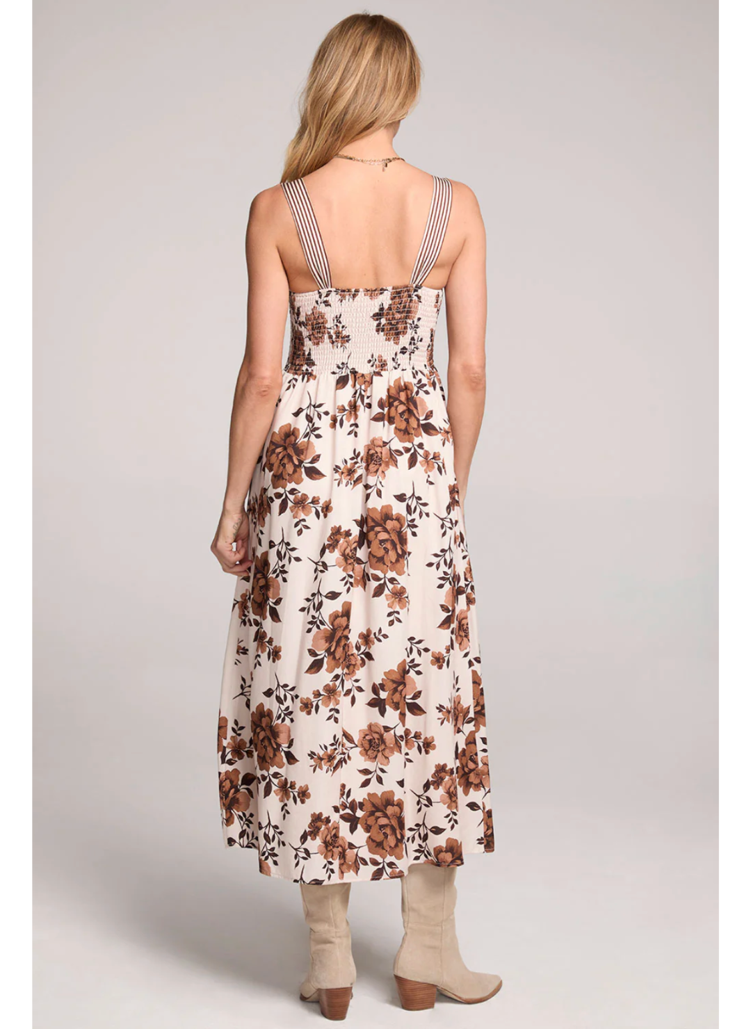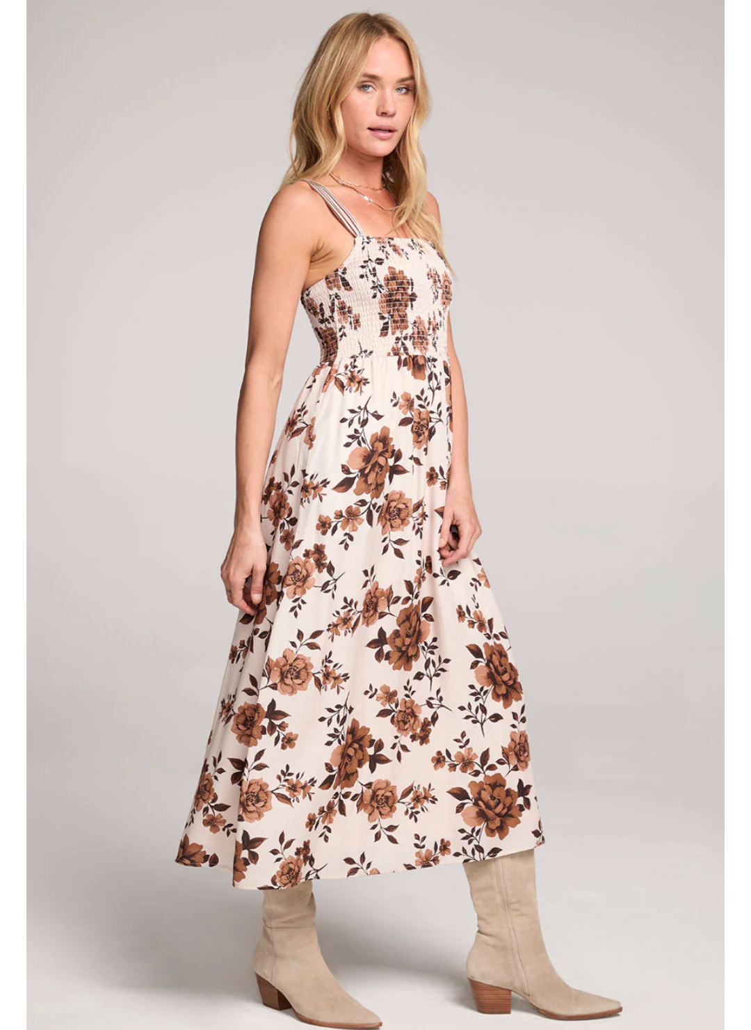 The Saltwater Luxe Costa Dress is that effortlessly feminine piece that works for Sunday brunch, winery weekends, or fall weddings under twinkle lights. Designed with a smocked tank-style bodice and a flowy full-length skirt, this midi dress flatters every curve while keeping comfort front and center. The oversized botanical floral print in warm mocha and cream tones adds that touch of vintage romance we all crave.