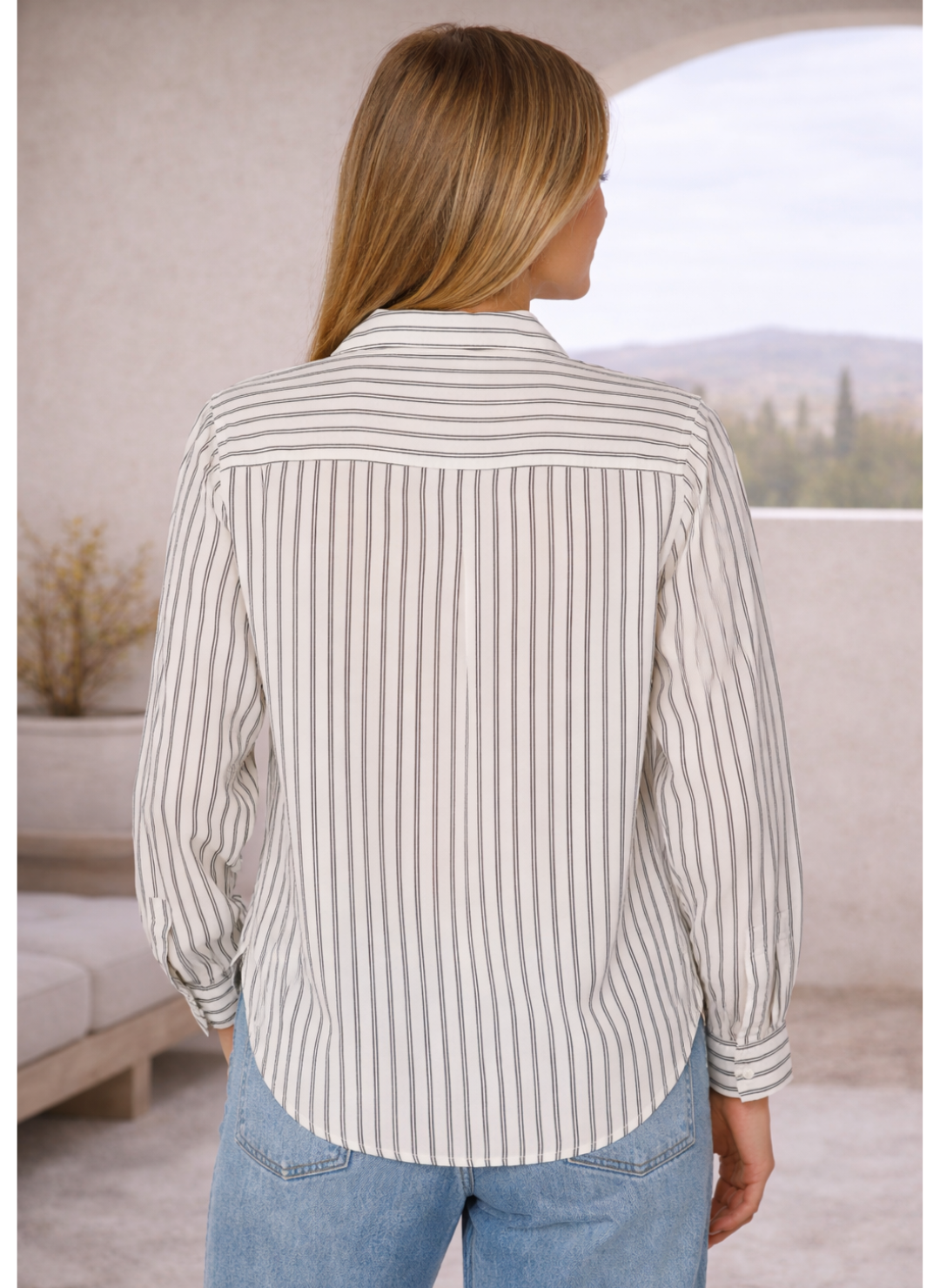 One of our favorite ways to wear it is paired with our Risen Sandy Slouchy 2 Tone Denim. The laid-back feel of the denim balances perfectly with the clean stripe pattern, creating a look that’s polished on top and relaxed on the bottom — an easy outfit formula you’ll come back to again and again.