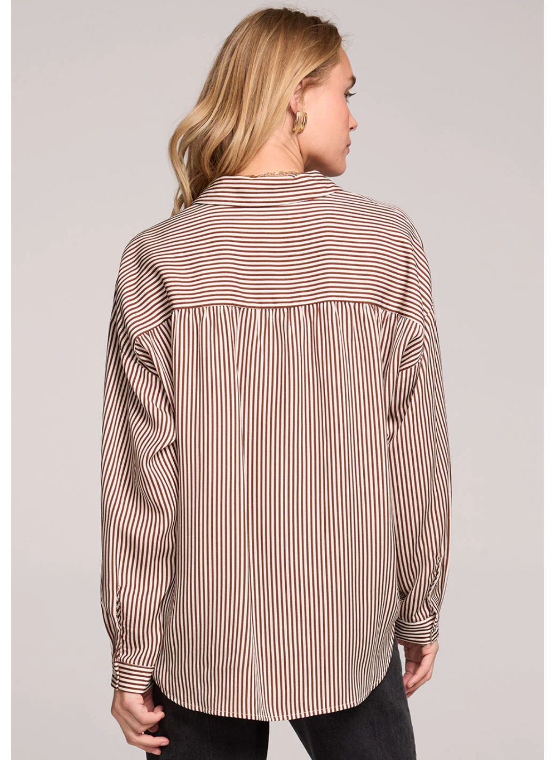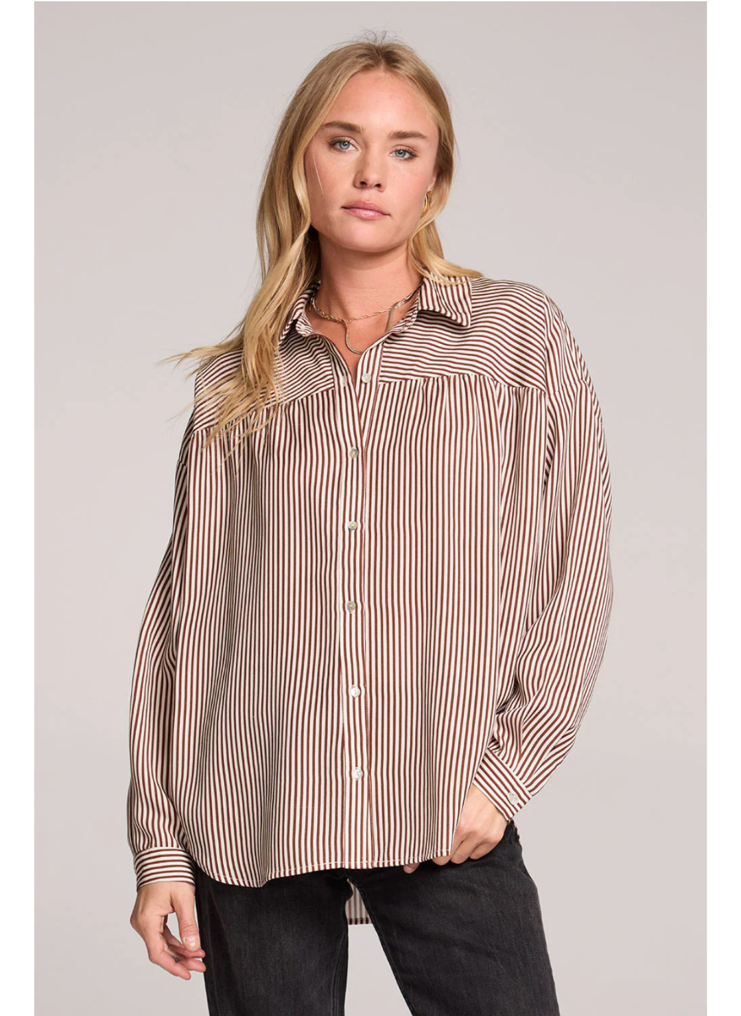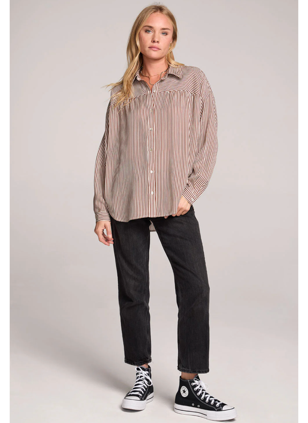 Meet your new wardrobe essential: the Saltwater Luxe Isadora Shirt. Classic, refined, and endlessly versatile, this top brings vintage-inspired tailoring into the modern woman’s wardrobe. Featuring petite brown and white pinstripes, the Isadora offers a crisp button-down silhouette with an easy, relaxed drape that flatters every shape. Whether you’re pairing it with denim for brunch or trousers for the office, this piece transitions seamlessly from day to night.