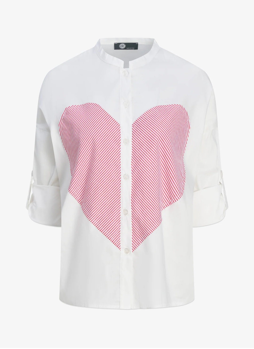 The M Made in Italy Heart Stripe Blouse blends classic tailoring with playful charm, featuring a bold red striped heart design that instantly steals the spotlight. Crafted in Italy from 100% breathable cotton, this blouse is lightweight, airy, and made for warm days when you still want to look polished.The crisp white base keeps things timeless, while the oversized heart motif adds just enough personality to turn heads. Designed with a relaxed silhouette, button-front closure, and roll-tab sleeves, this blouse works just as beautifully tucked into denim as it does worn loose over white pants or shorts. It’s equal parts elevated and easy—exactly what your August woman reaches for when she wants to look put-together without trying too hard.