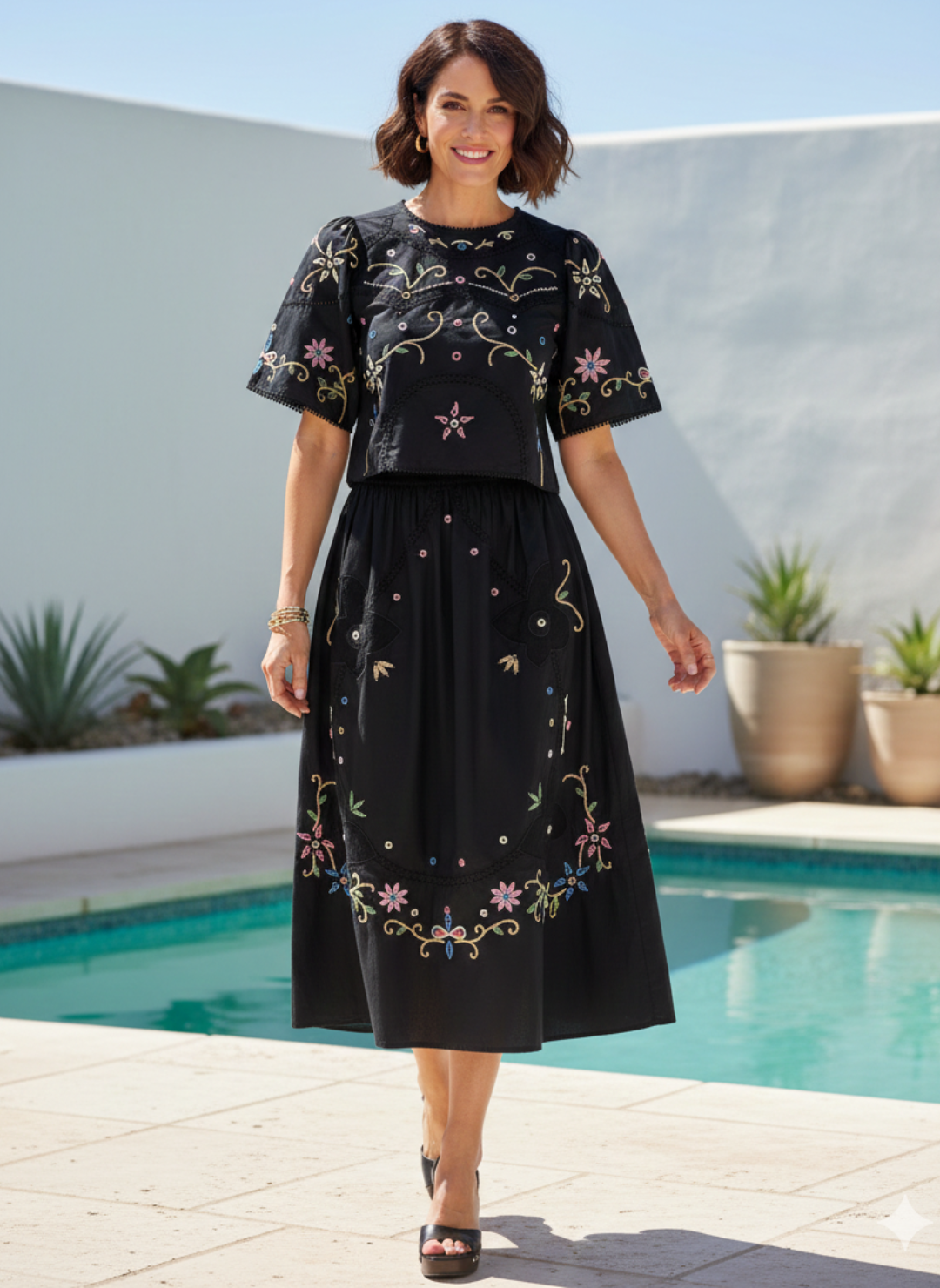 Accessory Tip: Let the embroidery do the talking—keep jewelry simple with gold hoops and a stacked bracelet.