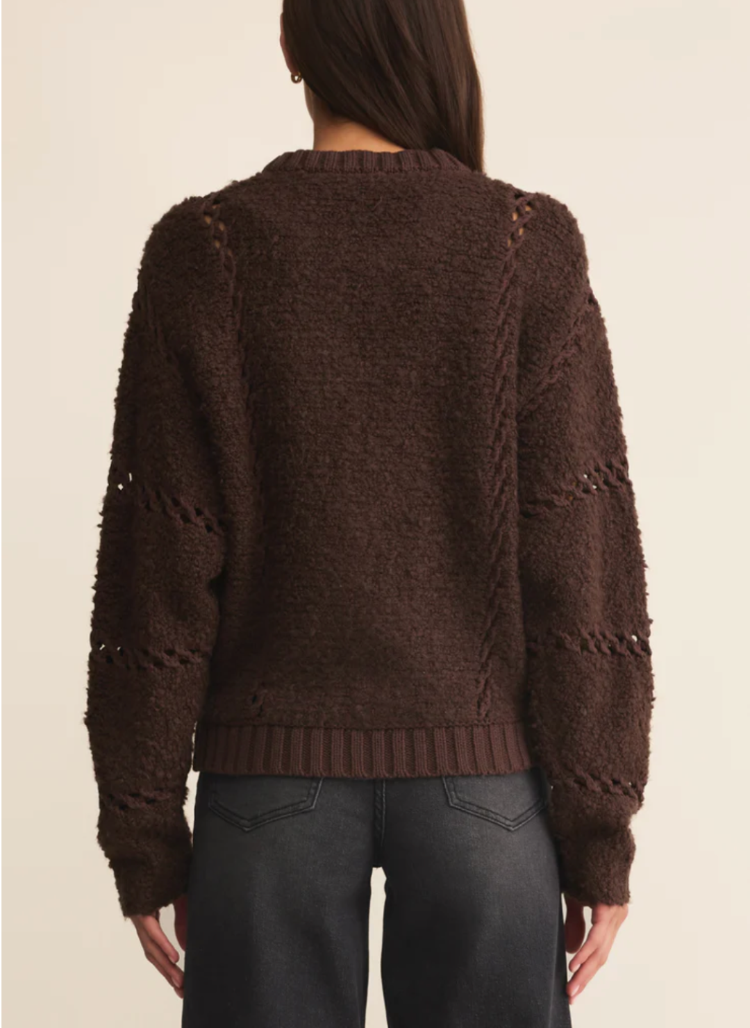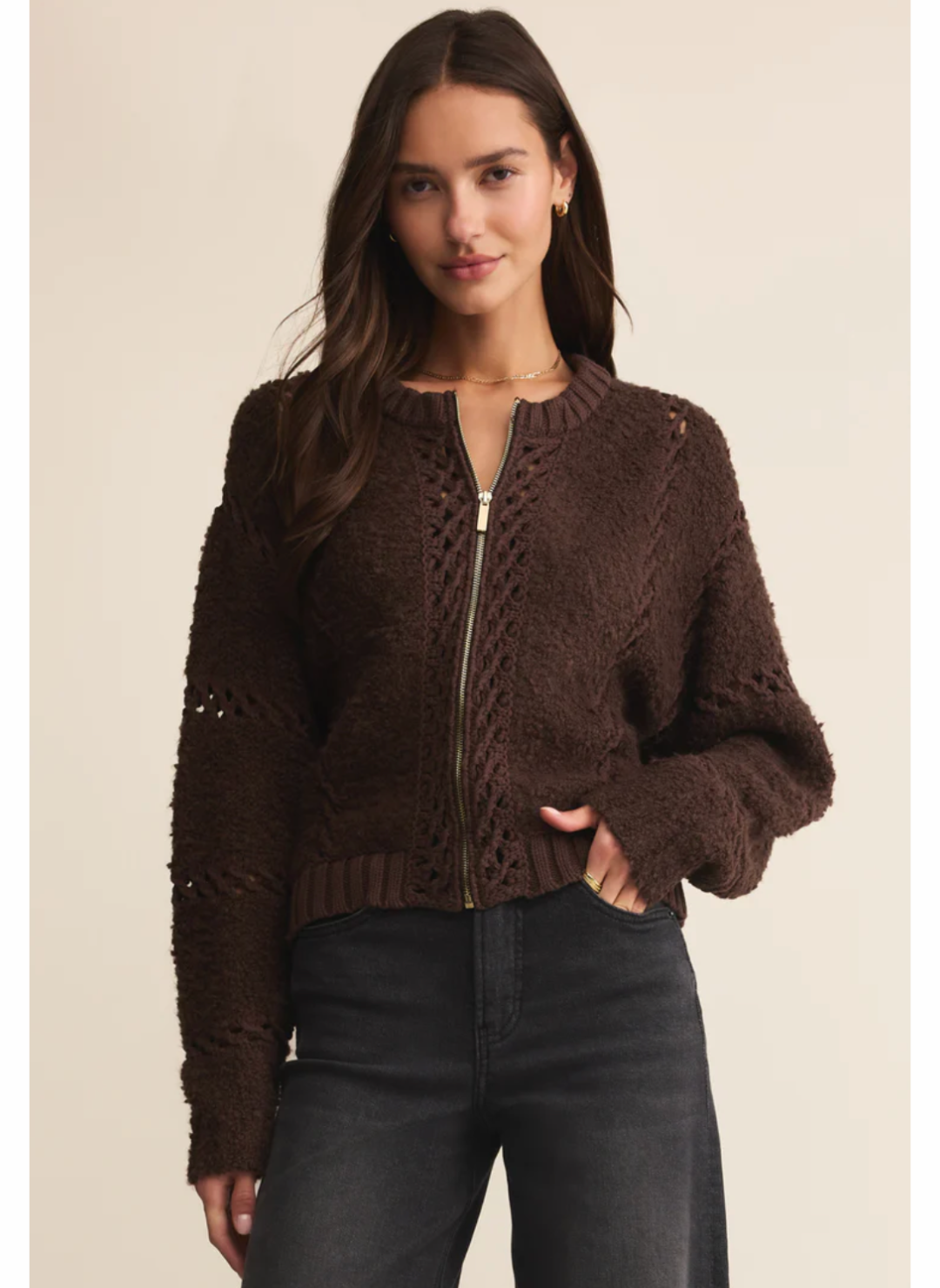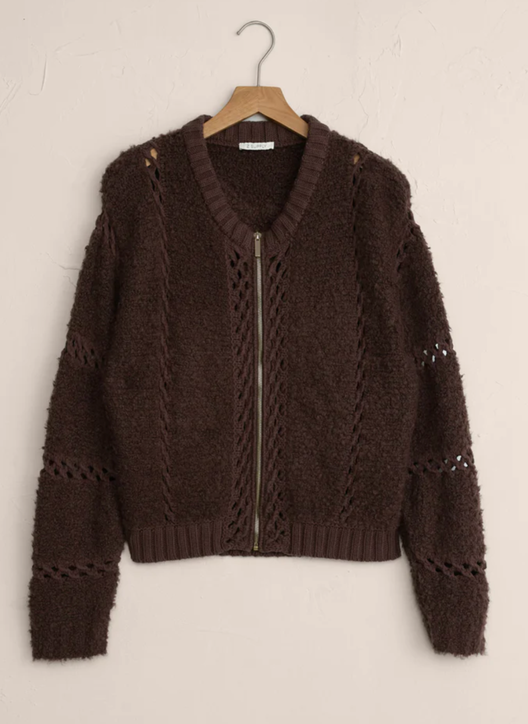 Meet the Z Supply Sundance Cardigan Jacket — where cozy meets chic. This zip-up sweater combines sumptuous high-pile yarns with intricate crochet insets, creating a piece that’s equal parts comfort and sophistication. With a relaxed fit, ribbed trim, and zip-front closure, it layers beautifully over anything from a silky cami to a crisp white tee. The deep espresso brown hue adds that rich fall warmth you’ll reach for again and again.