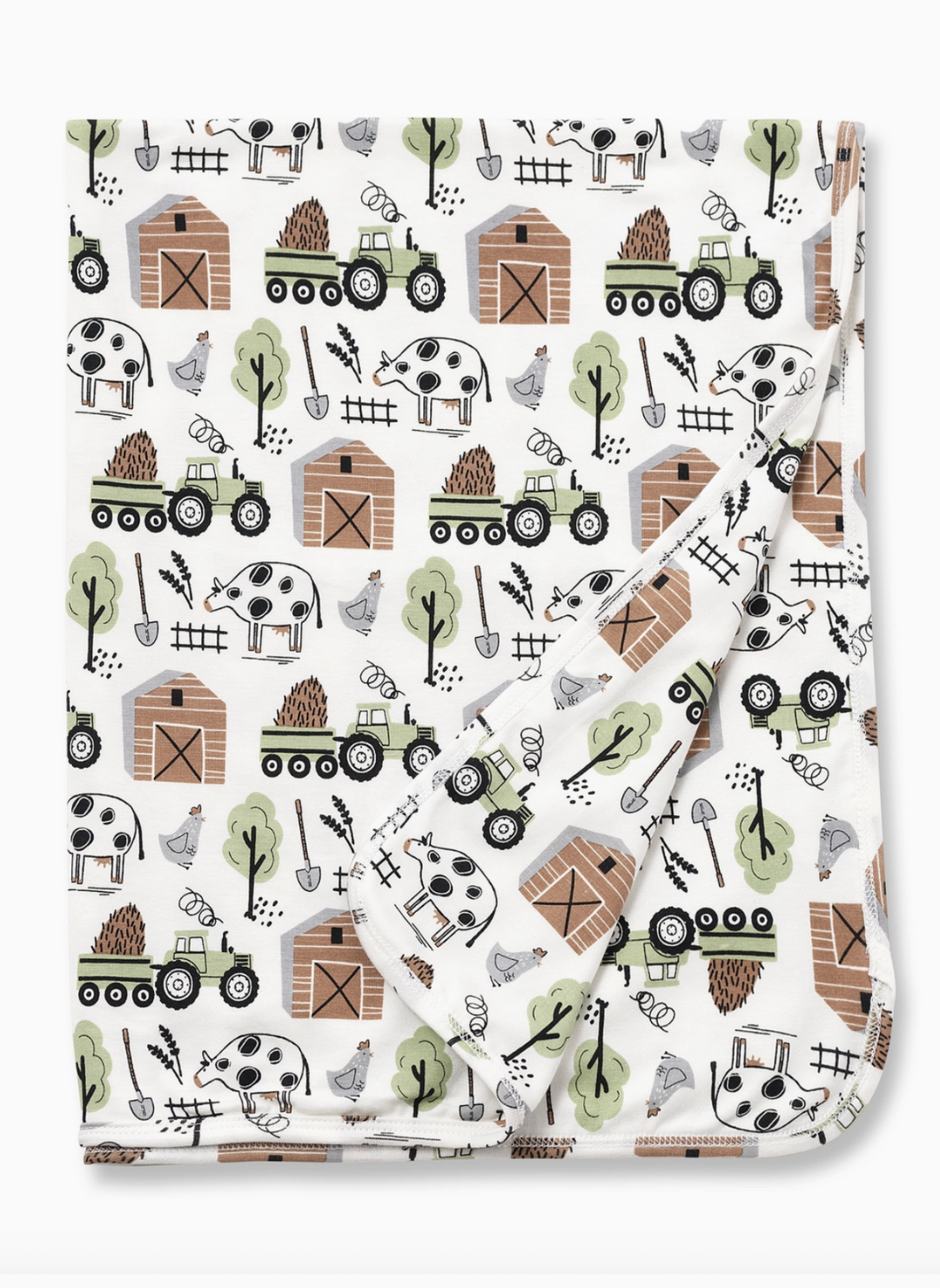 Baby boy's farm-themed stroller blanket, adorned with tractors, cows, barns, and more! Made from a soft blend of bamboo, cotton, and spandex, this ultra-soft blanket combines style and convenience. Match your little with the Barnyard Buddies Romper and your little ones will look adorable and feel comfortable in this absorbent, hypoallergenic, eco-friendly, and sweat-resistant blanket. For easy care, wash in warm water and tumble dry on low.