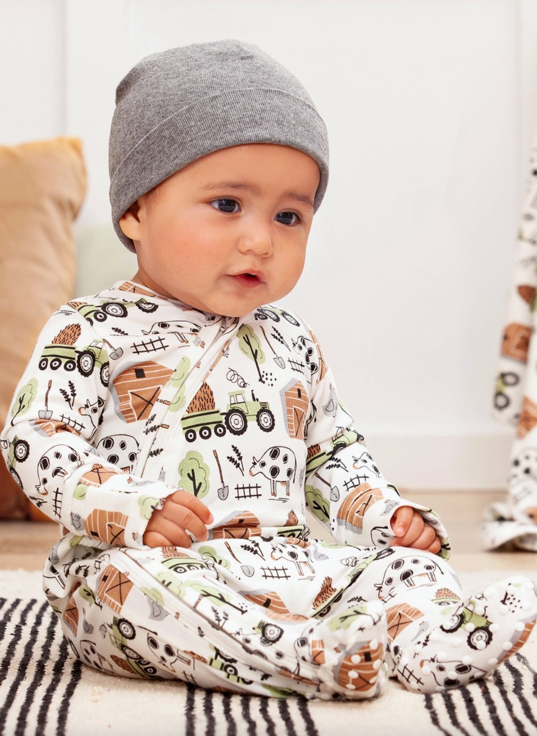 Baby boy's farm-themed romper, adorned with tractors, cows, barns, and more! Made from a soft blend of bamboo, cotton, and spandex, this ultra-soft romper combines style and convenience. The practical 2-way zipper ensures easy dressing, while the neck guard provides extra protection. Little ones will look adorable and feel comfortable in this absorbent, hypoallergenic, eco-friendly, and sweat-resistant piece. For easy care, wash in warm water and tumble dry on low.