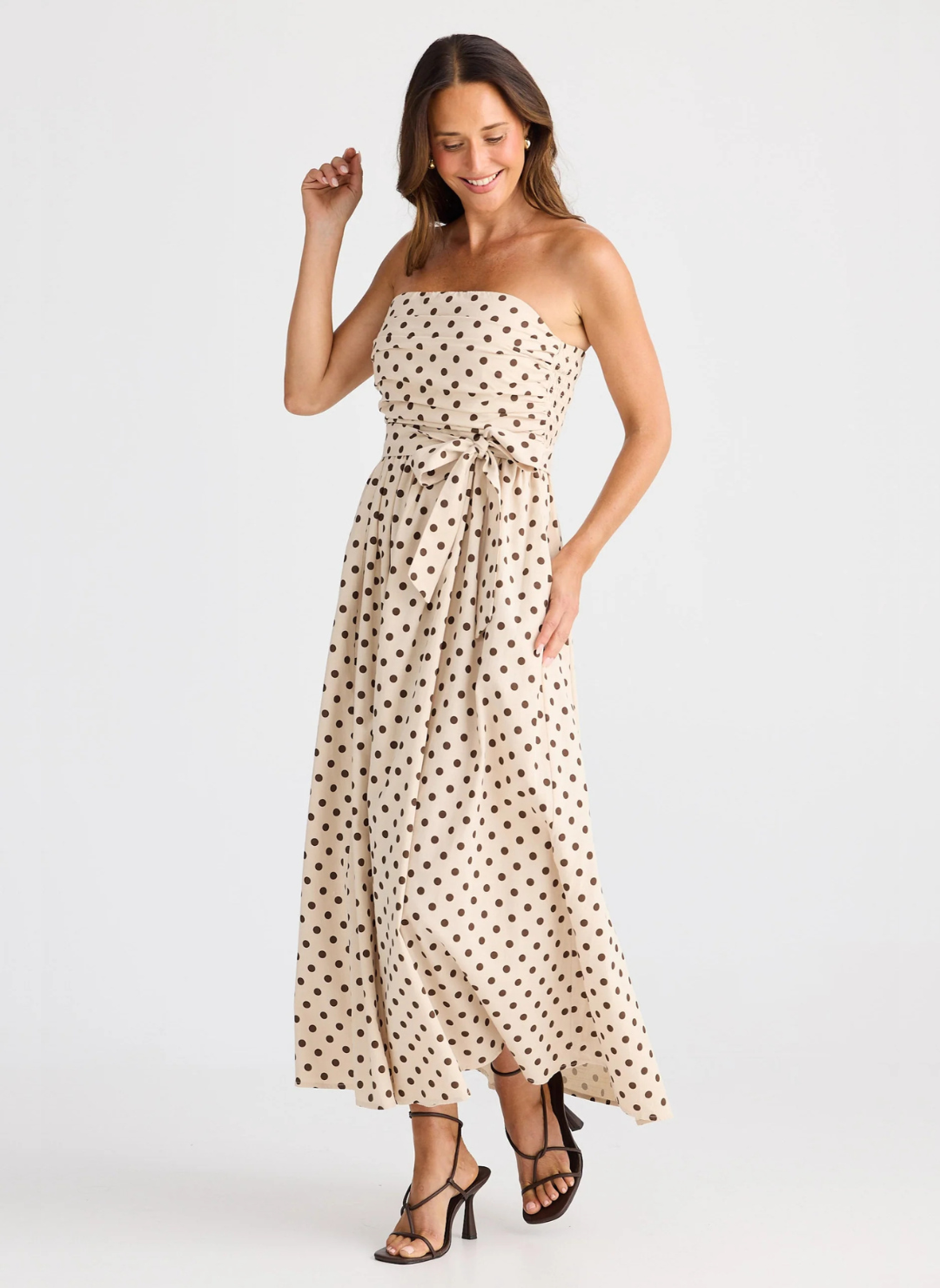The Brave & True Avalon Polka Dot Strapless Dress is the definition of timeless feminine style with a modern twist. Designed in a classic cream base with rich chocolate polka dots, this elegant maxi dress delivers effortless sophistication while remaining comfortable enough for warm days, wine country weekends, and summer events.