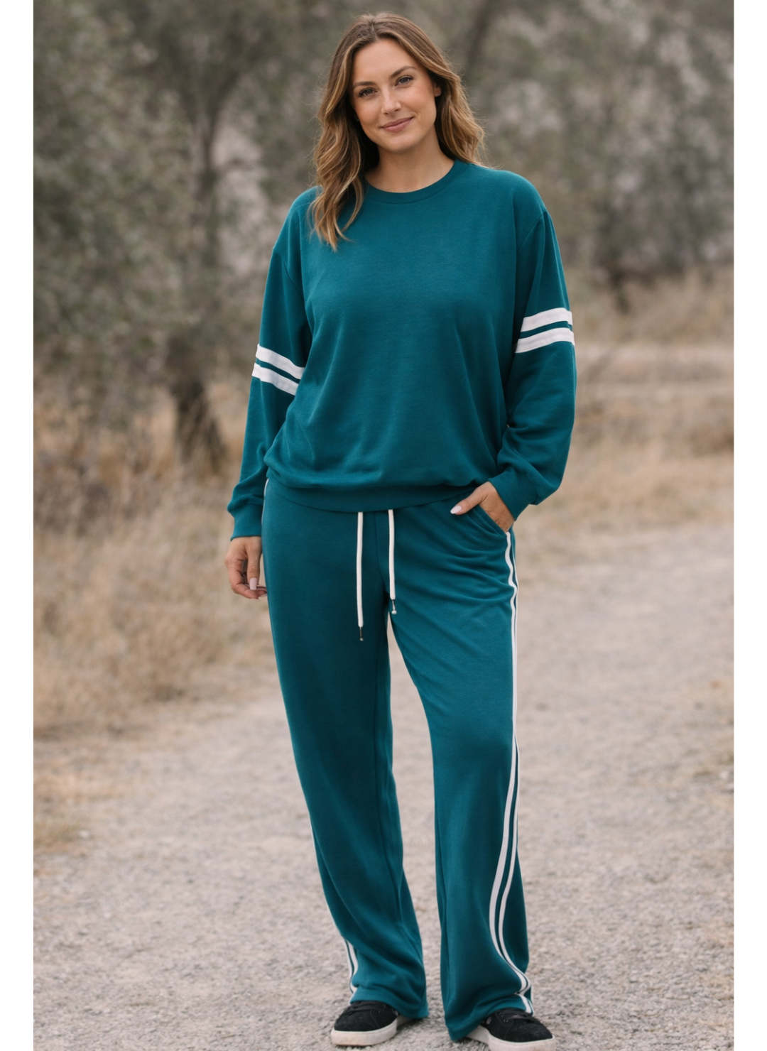 It has that relaxed fit we all love — not oversized, not clingy — just perfectly easy and flattering. Wear it with the matching Sandi Sweatpants for a head-to-toe lounge look or style it with denim for a casual everyday outfit that still feels polished.