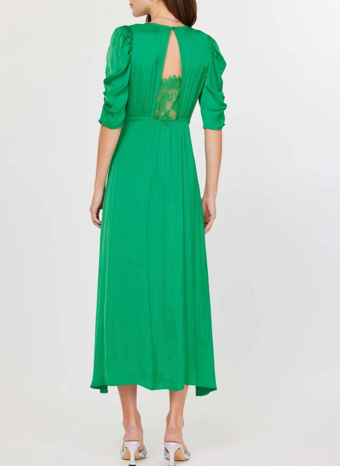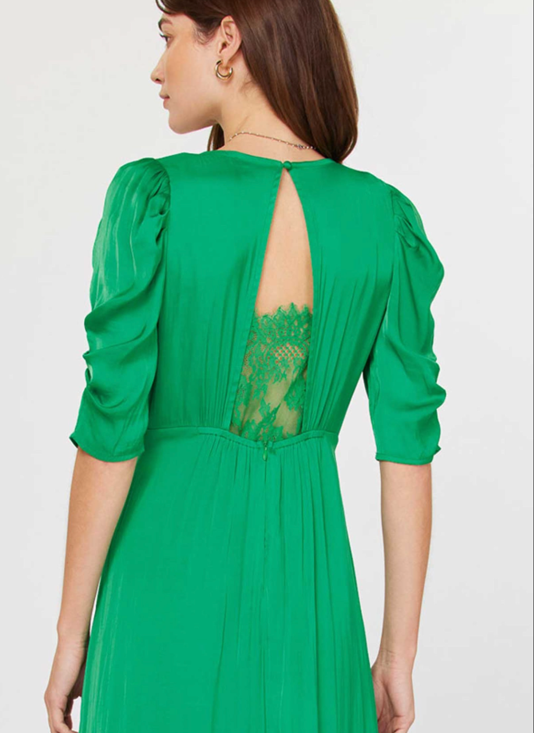 SEO Keywords: green midi dress, ruched sleeve midi, lace back dress, V-neck midi dress, Current Air dress, event guest dress