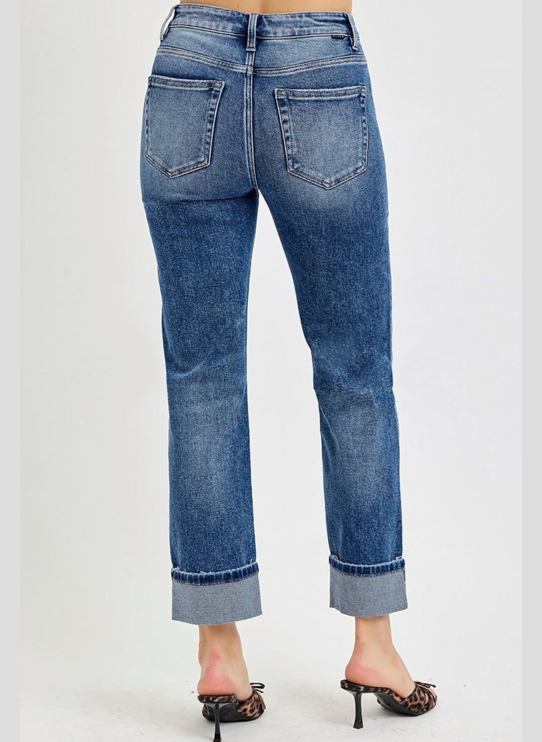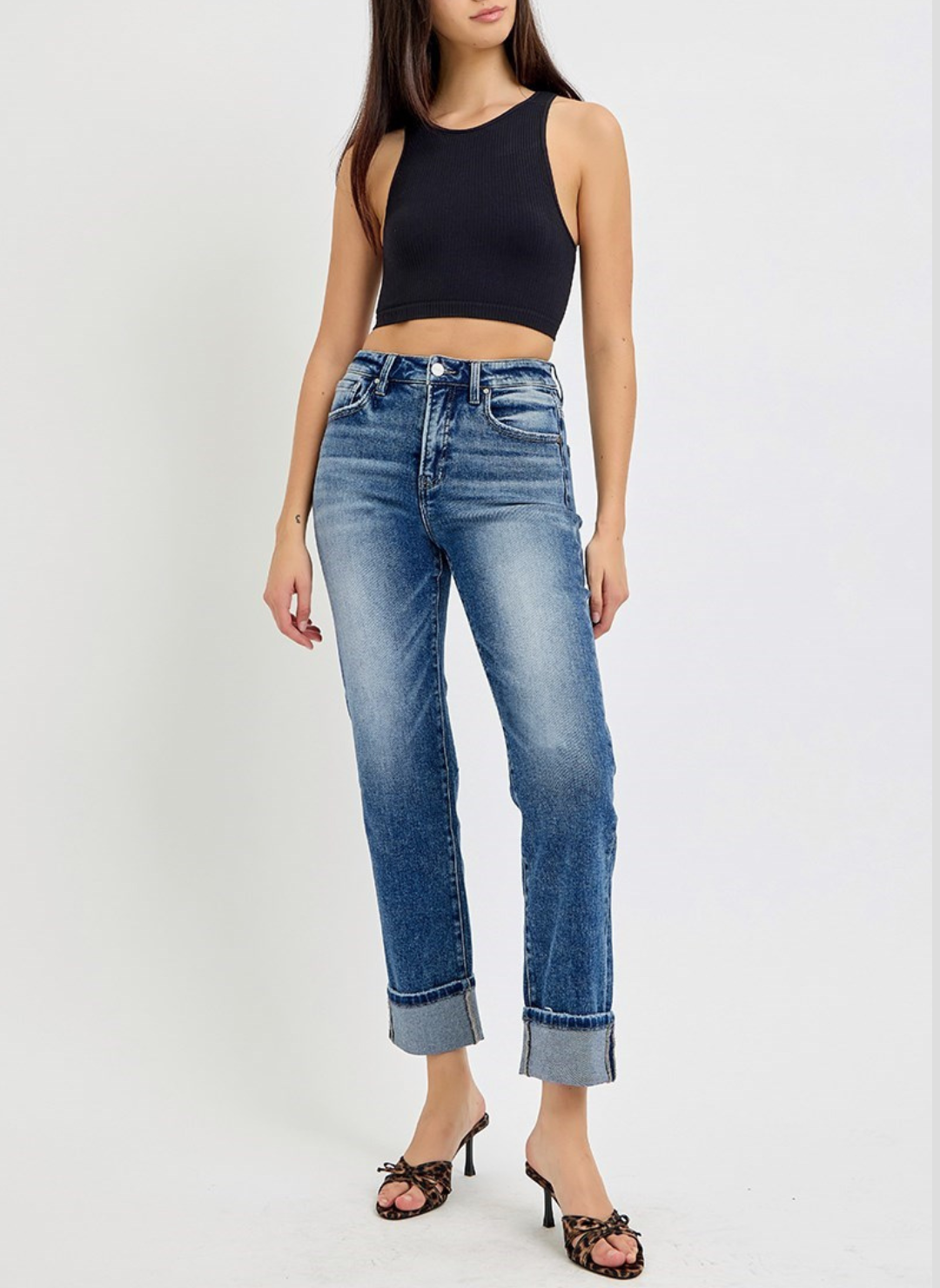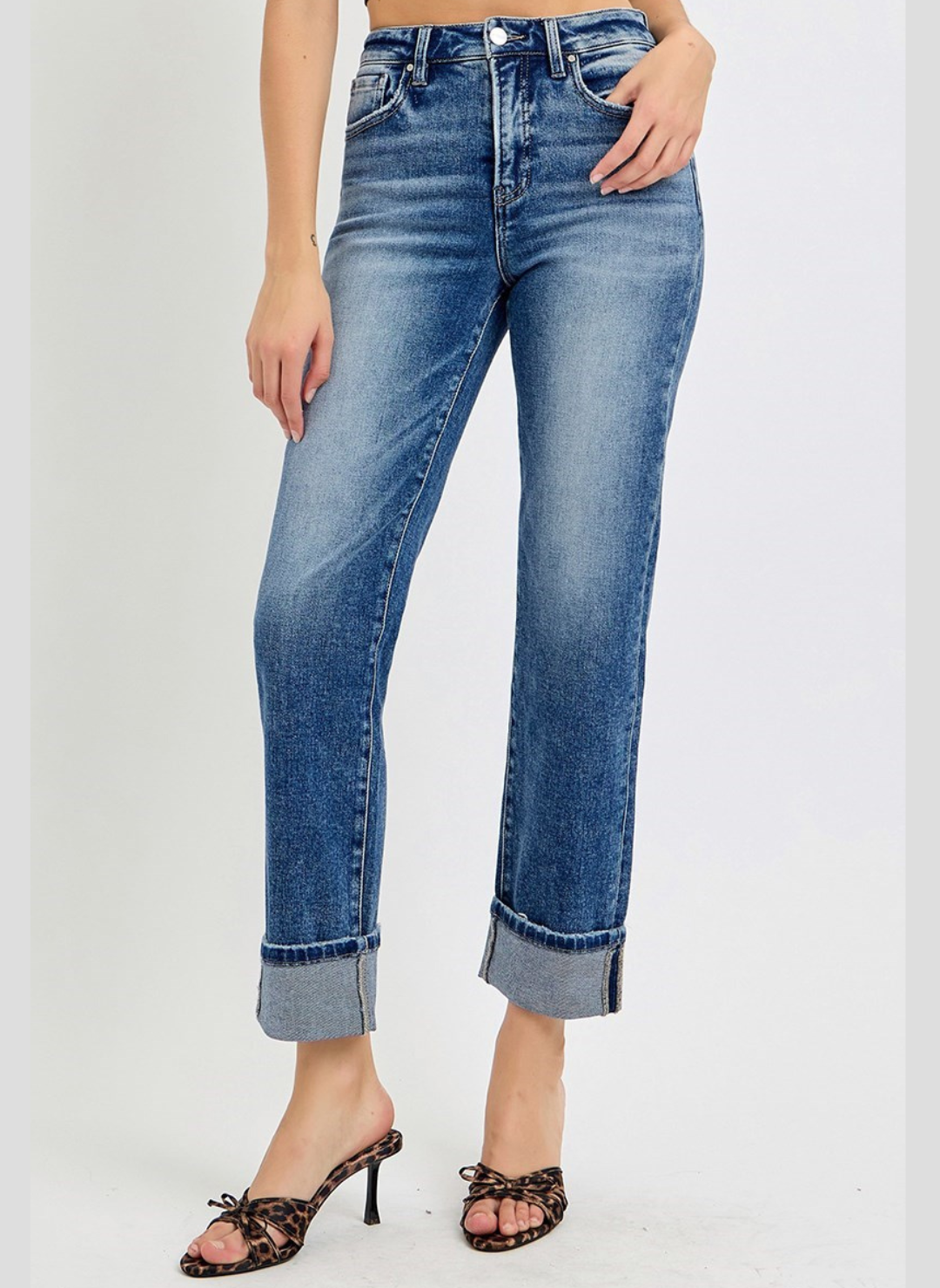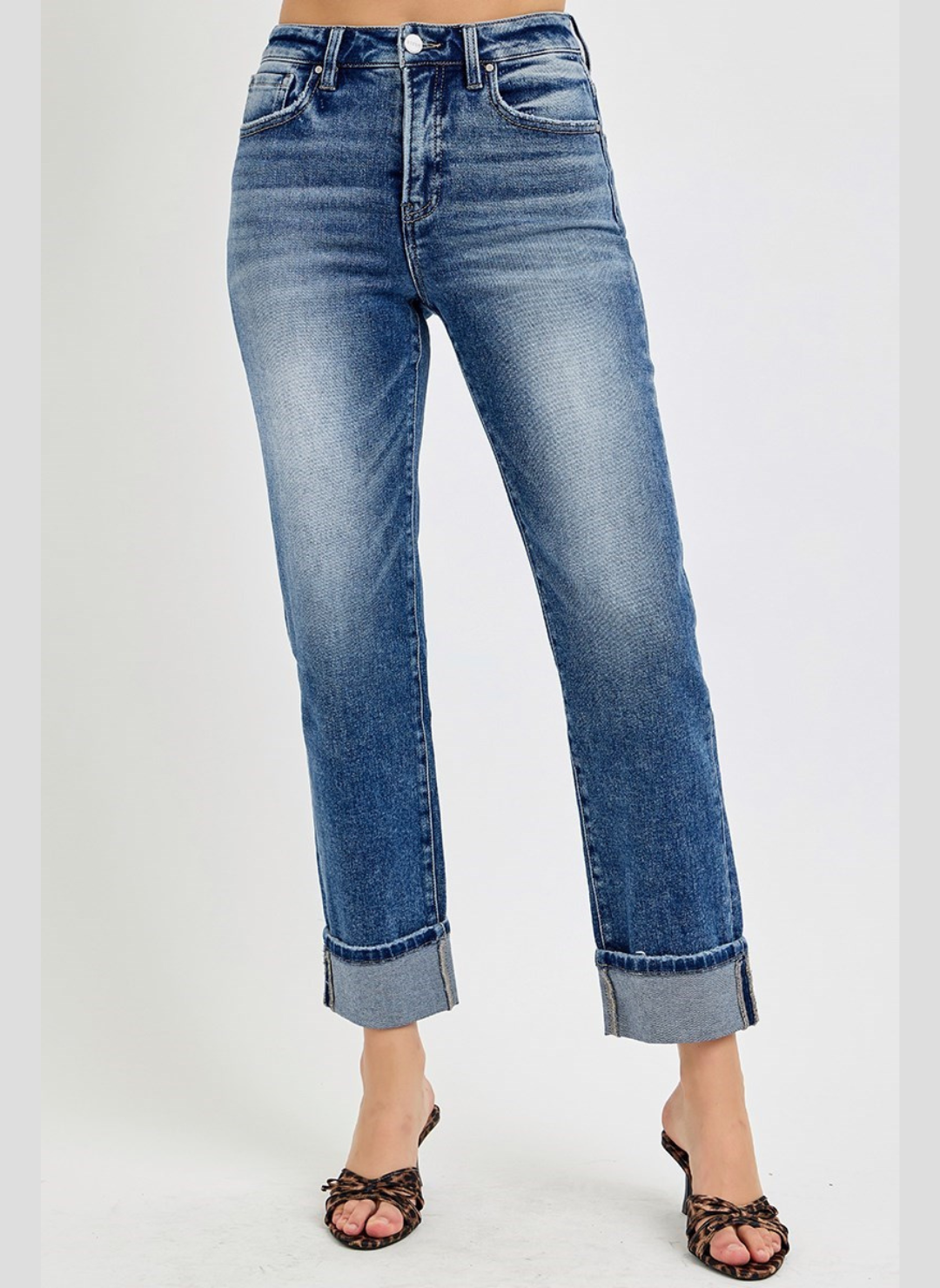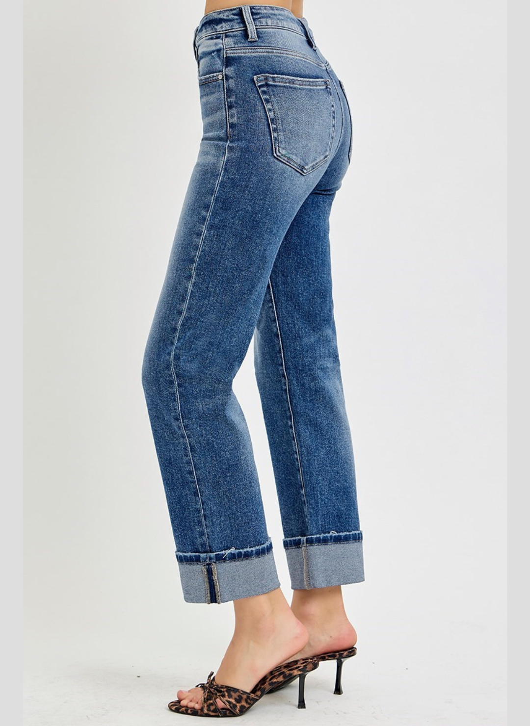 tummy control jeans, cropped jeans with cuff, Risen high rise jeans, flattering jeans for women, women’s boutique denim, stretch denim crop, casual cute jeans