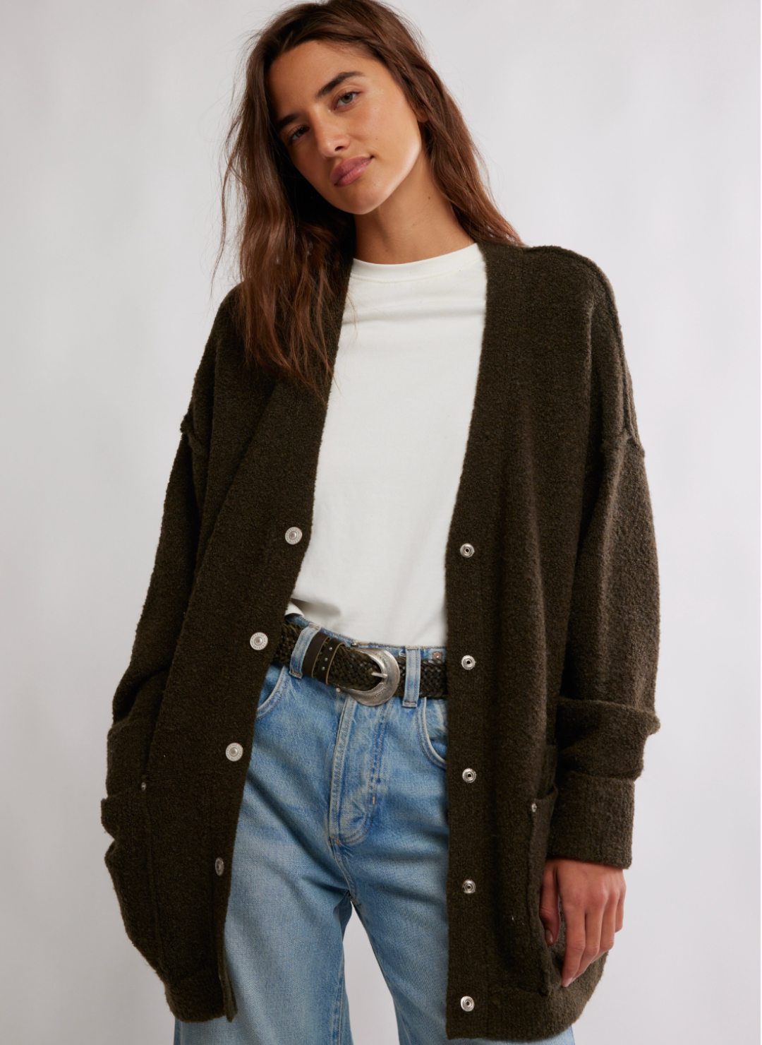 Cozy meets cool in the Free People WTF Blazin Cardigan — your go-to layering piece for every laid-back look. Designed with a perfectly oversized silhouette, this cardigan combines that signature Free People ease with modern utility-inspired details. Crafted from a soft boucle-like knit, it features shank front snaps and denim rivet accents on the patch pockets, giving it just the right amount of edge. Whether you’re dressing for a casual brunch or layering for cooler evenings, this cardigan delivers effortless comfort and timeless style.