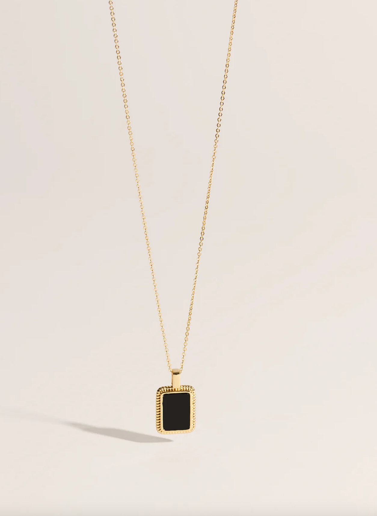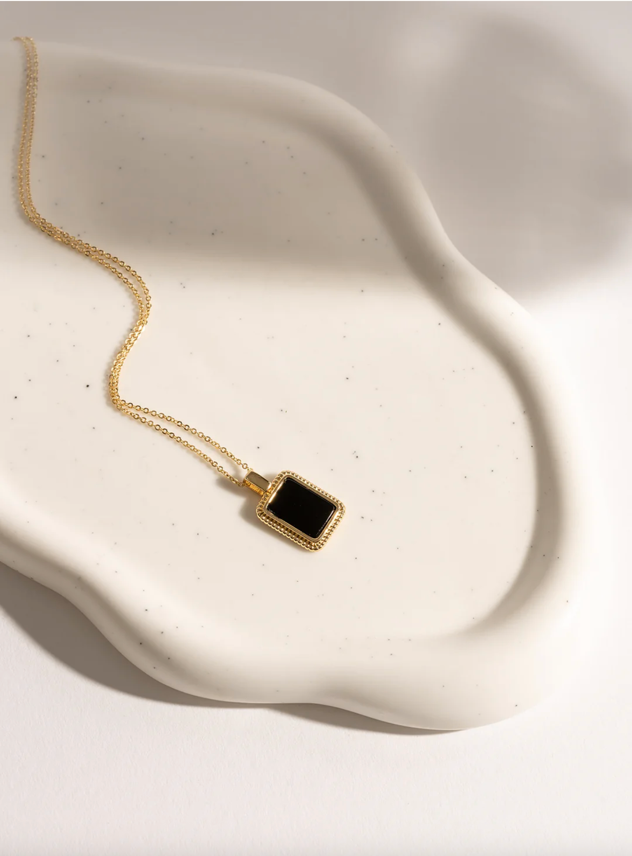 For the woman who walks into a room and owns it, the Eleanor Necklace is the perfect finishing touch. Featuring a black agate gemstone set in a handcrafted gold medallion, this piece blends timeless elegance with modern edge. Suspended from a delicate 14k gold-filled 1.2mm flat chain, the 18” length gives you versatility to wear it solo or layered, depending on your vibe.
