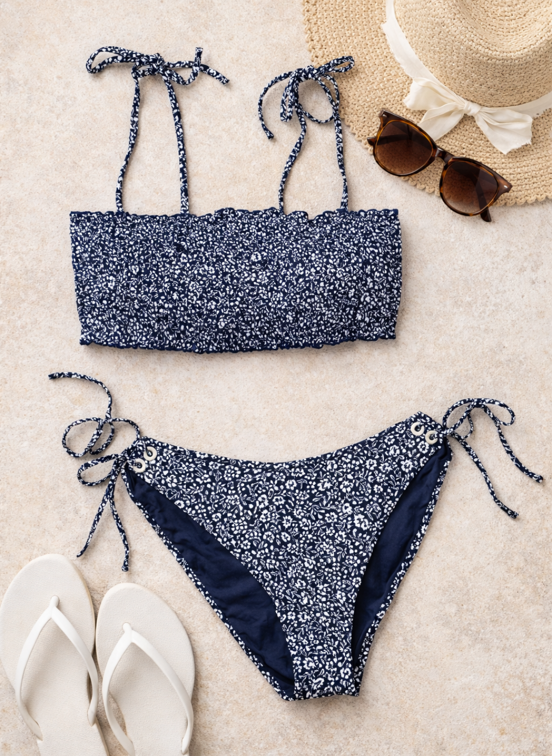 The smocked bandeau-style silhouette offers comfortable stretch and a secure feel, while the adjustable shoulder ties allow you to customize the fit exactly where you want it. Whether you’re lounging poolside, heading to a resort getaway, or mixing and matching with your favorite swim bottoms, this top strikes the perfect balance between style and ease.