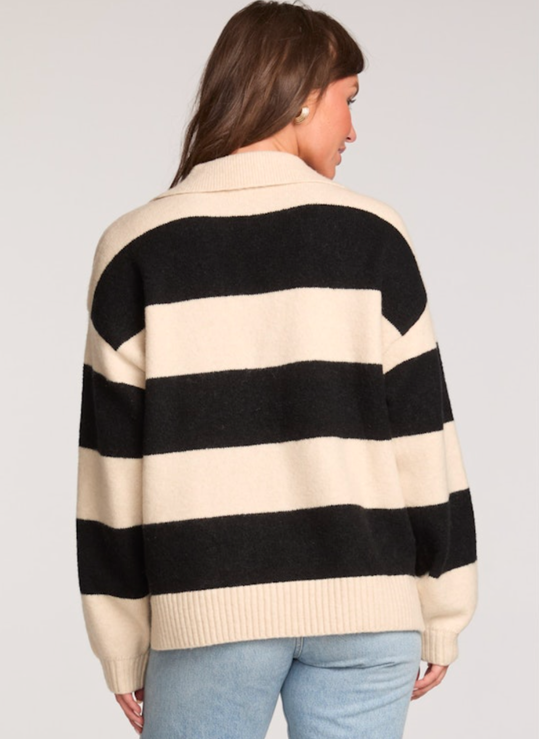 The name says it all — meet the Queen B Sweater, your new cold-weather crown jewel. With its bold black-and-cream stripes, soft knit texture, and relaxed drop-shoulder fit, this Saltwater Luxe piece turns every coffee run, school pickup, and weekend wine tasting into a style moment.