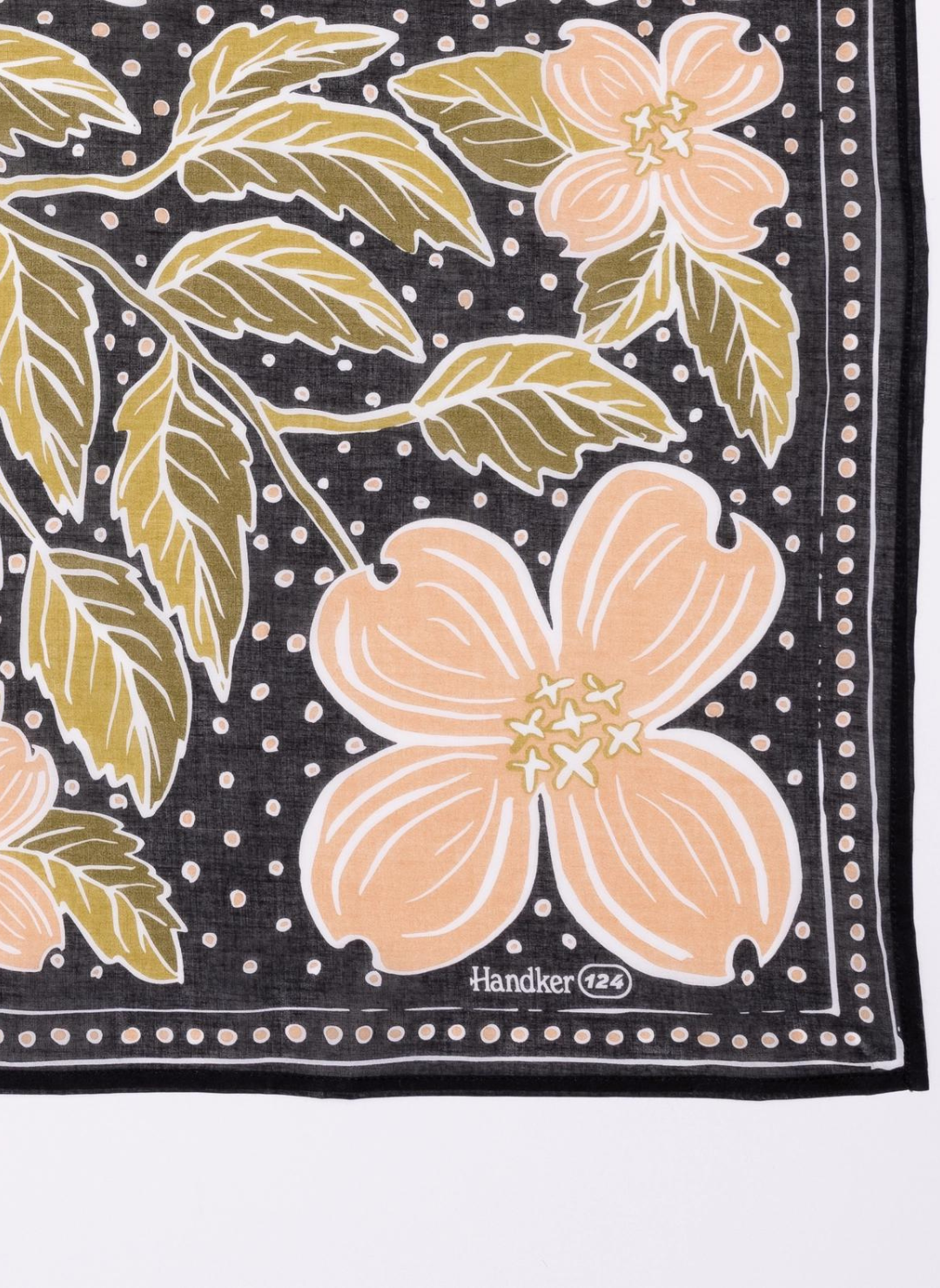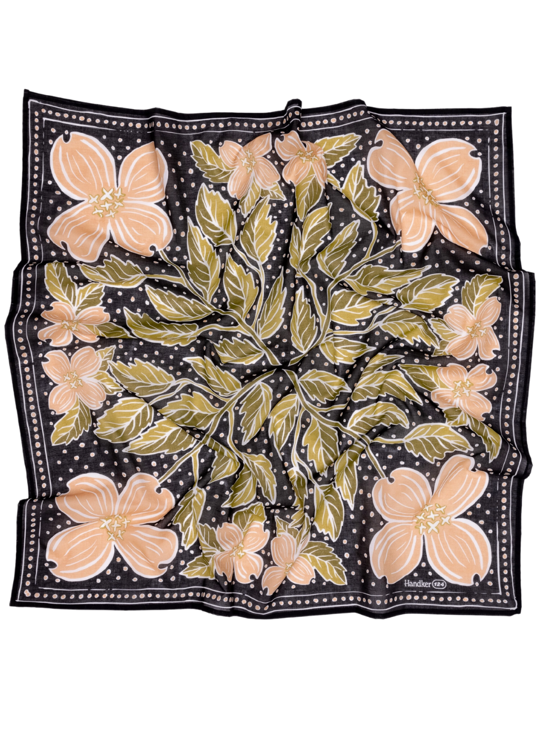 Color: Black with peach and green dogwood flowers