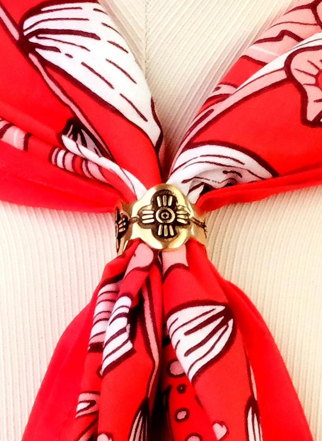 Our Tribal Bandana ring is a charming ring adorned with petite blooms and a scalloped edge. This artsy piece is beautifully decorated with floral illustrations, exuding a delightful Southwest tribal vibe. Pair it with the Savannah or Montana Bandana!