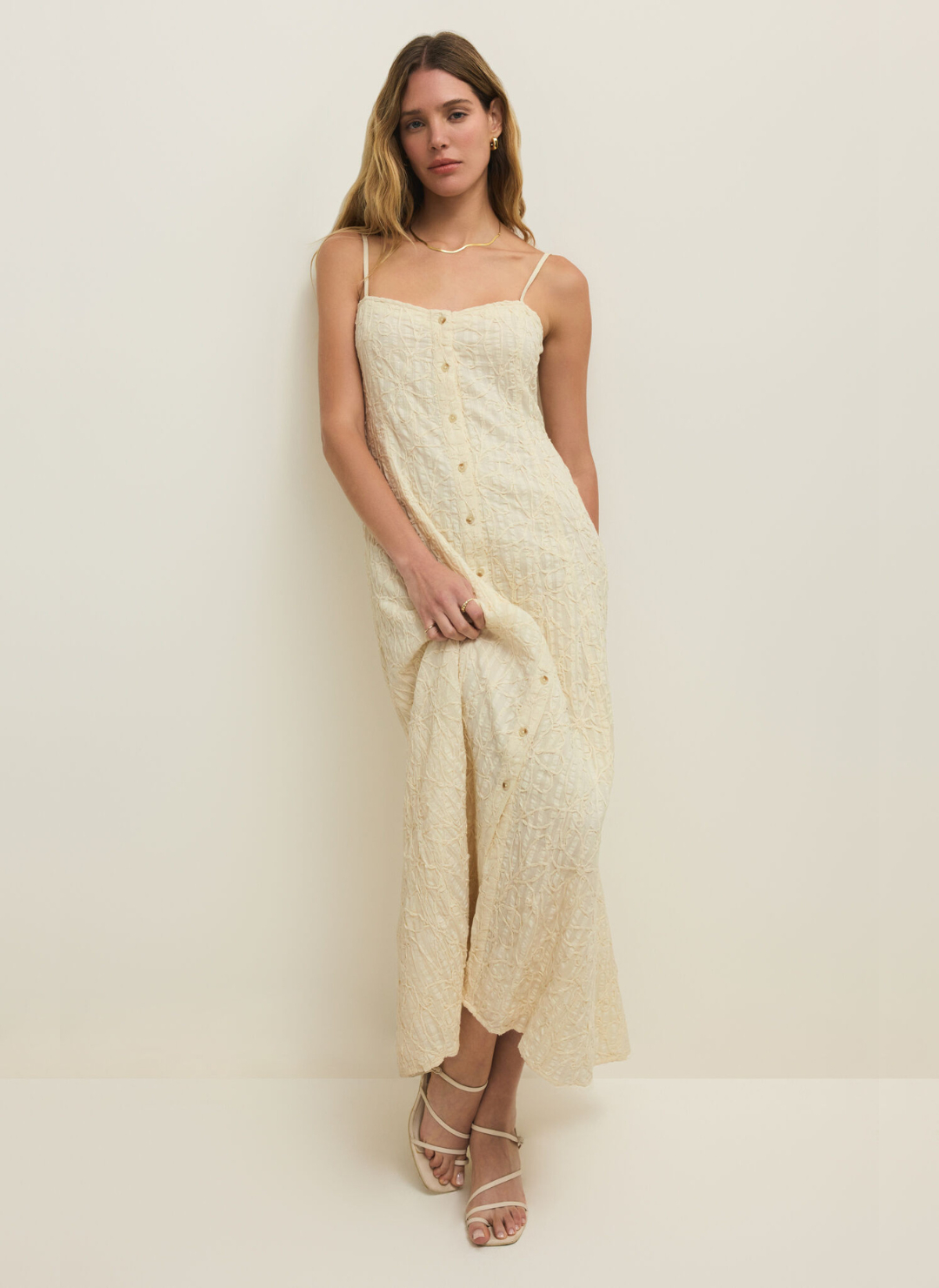 Effortlessly feminine and beautifully detailed, the Z Supply Angel Eyes Textured Midi Dress is a timeless piece for warm-weather days. Crafted from 100% Cotton Dobby with embroidered texture, this dress combines lightweight breathability with a softly structured feel. Designed with a sweetheart neckline, adjustable spaghetti straps, and a button-down front, it flatters the figure while offering everyday ease. The heavy soft wash finish adds a lived-in touch, while the midi length creates a graceful, flowy silhouette perfect for any occasion.
